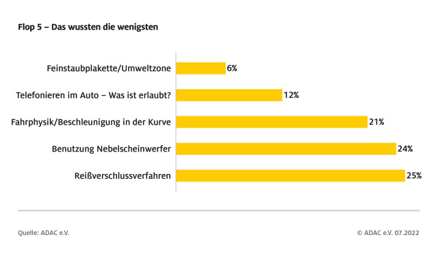 Deutlich schlechter sah es hingegen beim Wissen um Regelungen zum Befahren von Umweltzonen aus: Nur sechs Prozent wussten, dass nicht nur Benzin- und Diesel-Pkw eine Feinstaubplakette benötigen, sondern auch Elektro-Autos. Details zum Telefonieren im Auto hatten nur zwölf Prozent auf dem Schirm, und nur 25 Prozent wussten, wo das Reißverschlussverfahren angewendet wird.