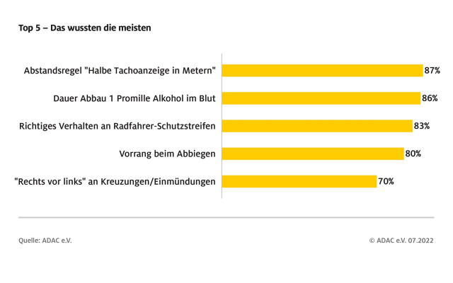 Am häufigsten wurde die Frage zum erforderlichen Abstand zu Vorausfahrenden korrekt beantwortet, die Regel "halber Tacho" hatten 87 Prozent verinnerlicht. Fast genauso viele wussten, wie schnell ein Promille Alkohol im Blut abgebaut wird. Wichtige Verhaltensweisen an Kreuzungen, etwa bei "Rechts vor Links", wussten immerhin 70 Prozent zu beantworten.