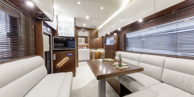 Lifestyle. Die Wohnlandschaft im VARIO Alkoven vermittelt ein beeindruckendes Raumgefühl, das an ein Luxus-Apartment erinnert. Eine intelligente Lichtsteuerung setzt das Mobil in Szene. Hochwertige Verarbeitung und luxuriöses Ambiente zeigt der handwerkliche Möbelbau in moderner Farbgebung. Matt weiß kontrastiert mit erlesenem Nussbaumholz, „bentART“ Design mit gerundeten Möbelfronten. Erlesene Materialien wie der beheizte Feinsteinzeug Boden in Küche und Bad, die Corian® Arbeitsplatte, Leder Polster und die großzügige Wohnlandschaft verleihen dem Innenraum außergewöhnliche Eleganz.