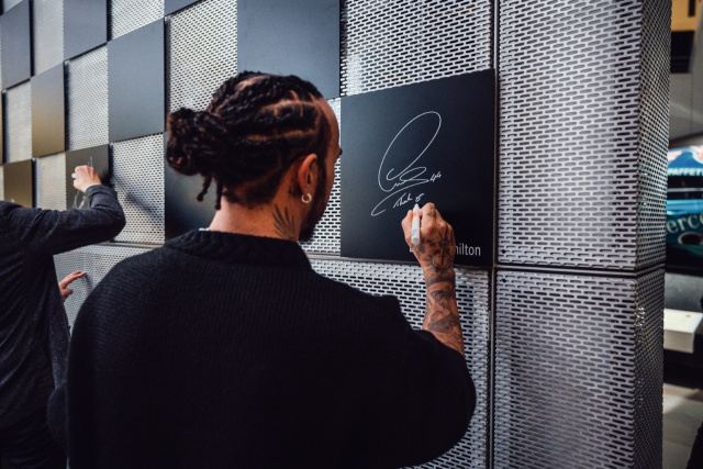 Neben der Formel 1®-Sonderpräsentation besuchte Lewis Hamilton auch die neue Mitmachstation „Boxenstopp“ im Raum Mythos 7: Silberpfeile – Rennen und Rekorde und verewigte sich dort mit seiner Unterschrift. Das interaktive Angebot begeistert seit Kurzem die Besucherinnen und Besucher. Fortan können sie sich an der Rekordmarke des schnellsten Boxenstopps messen, die derzeit bei 1,8 Sekunden liegt.