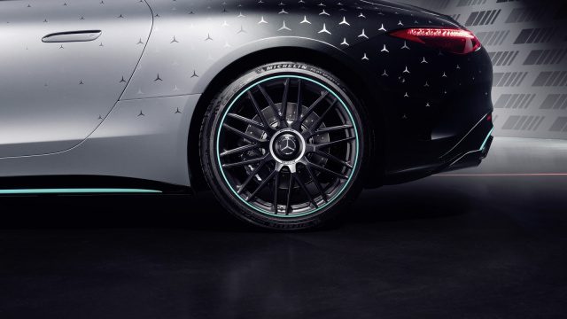 Typisch Formel-1-Silberpfeil: der Farbverlauf von Hightechsilber metallic nach Obsidianschwarz metallic und das Star Pattern an den Fahrzeugflanken sowie PETRONAS‑farbene Kontraste. Letztere finden sich an Frontschürze, Seitenschwellerverkleidungen und Heckdiffusor.