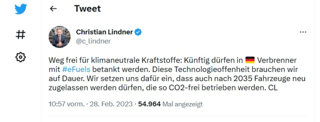 Also doch: Deutschland ist bereit, synthetischen Kraftstoffen eine Chance zu geben. Die Entscheidung pro eFuels verbeitete sich noch nicht in einem offiziellen Statement der Bundesregierung - doch haben hochrangige FDP-Vertreter (nicht zuletzt stellt die FDP derzeit ja auch den Bundesverkehrsminister) die Botschaft, dass der Verbrenner nach 2034 klimaneutral betankt werden kann, verbreitet. "Weg frei für klimaneutrale Kraftstoffe: Künftig dürfen in Deutschland Verbrenner mit #eFuels betankt werden. Diese Technologieoffenheit brauchen wir auf Dauer. Wir setzen uns dafür ein, dass auch nach 2035 Fahrzeuge neu zugelassen werden dürfen, die so CO2-frei betrieben werden.“ twitterte z. B. Finanzminister und FDP-Vorsitzender Christian Lindner. Mit der sicherlich hart umrungenen Entscheidung innerhalb der Ampelkoalition geht die Deutschland auf Rammkurs zu EU-Parlament und EU-Kommission.