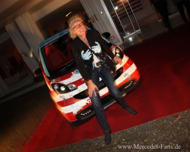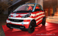 Die Pop-Art Künstlerin Freddy Reitz hat ein Kunstwerk von buchstäblicher Dynamik geschaffen: Einen smart fortwo, von Hand mit Acrylfarben bemalt nach ihrem Werk US Flag. Zur Eröffnung ihres neuen Studios Freddy Twoo in der Berliner Riemeister Straße präsentierte die Pop-Art Künstlerin am 6. November erstmalig ihre Interpretation eines smart fortwo coupé passion micro hybrid drive mit 52 kW Motor. Zu dem von Freddy Reitz entworfenen Design gehört unter anderem ein edles Lederinterieur aus der BRABUS tailor made Schmiede. Das in Berlin vorgestellte Exklusivmodell wird die Basis für das Sondermodell smart fortwo Freddy Reitz edition sein, das in Kleinserie gebaut werden wird.
