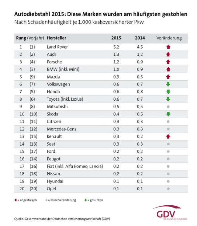 Während Mercedes-Benz bei den Verkaufszahlen deutlich vor seinen Premiumkonkurrenten Audi, BMW, Porsche, Jaguar & Co steht, zeigt sich auf der Beliebtheitskala der Autoknacker ein ganz anderes Bild. Hier wird nicht oft zugegriffen! Gemäß der Autodiebstahlstatistik der Deutschen Versicherer, die am 11.10. veröffentlicht wurde, liegt die Marke Mercedes-Benz im Ranking der Autodiebstähle (nach Schadenhäufigkeit je 1000 Pkw) „nur" auf Platz 12.