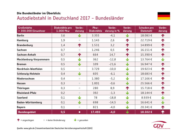 Die gute Nachricht zuerst: Nach dem Autodiebstahl-Report des Gesamtverbandes der Deutschen Versicherungswirtschaft (GDV) kamen im Laufe des Jahres 2017 insgesamt 17.493 Pkw ihren rechtmäßigen Besitzern abhanden - im Vergleich zum Vorjahr bedeutet dies einen Rückgang der Zahl der Autodiebstähle im Vergleich zum Vorjahr um vier Prozent. Jetzt kommt die schlechte Nachricht: Während sich Besitzer von Kleinwagen und Opel-, Fiat- oder Citroen-Fahrer eher geringe Sorgen um einen Diebstahl ihrer Autos machen müssen, stehen luxuriöse SUVs und Limousinen von Premium-Herstellern höher im Kurs den je. Den größten Kummer mit der Seuche Autoklau haben die Berliner. Berlin ist auch im Jahr 2017 die Hauptstadt der Autodiebe - und zwar mit sehr, sehr großem Abstand