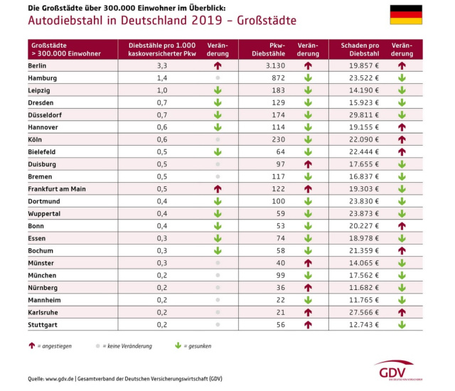 Im Vergleich der Bundesländer und Großstädte hatte Berlin erneut die mit Abstand höchste Diebstahlrate. Hier wurden im Laufe des vergangenen Jahres 3.130 kaskoversicherte Pkw gestohlen, rund neun Prozent mehr als im Vorjahr. Inzwischen findet mehr als jeder fünfte Autodiebstahl bundesweit in Berlin statt, die Diebstahlquote stieg von 3,1 auf 3,3 von 1.000 kaskoversicherten Pkw. Ebenfalls vergleichsweise hohe Diebstahlraten ergaben sich für Hamburg (1,4) und Leipzig (1,0). Deutlich geringer war die Diebstahlgefahr im Süden der Republik – so wurden in Bayern und Baden-Württemberg zusammen nicht einmal halb so viele Autos geklaut wie allein in Berlin.