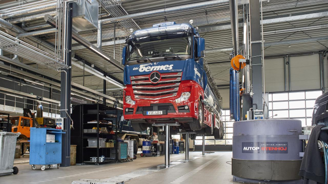 Die gemeinsam mit Experten der Daimler AG konzipierte Lkw-Werkstatt ist, genau wie im Transporter-Service, auf die Optimierung aller Abläufe ausgelegt. Zwei Stempelhebebühnen ermöglichen dem Team komplette Sattelzugmaschinen bis zu einem Gewicht von 95 Tonnen zu heben und die zeitoptimierte Bearbeitung aller sechs Achsen. Und falls ein Fahrzeug einmal nicht innerhalb der verlängerten Öffnungszeiten von 7.00 bis 22.00 Uhr fertiggestellt werden kann, stehen für die Fahrer zwei Schlafräume kostenfrei zur Verfügung. Eine weitere Besonderheit ist der Dacharbeitsplatz, um die Instandhaltung der im Lkw- und Busdach verbauten Technik, wie z. B. Dachklimaanlagen für das Werkstatt-Team zu erleichtern und somit sicher und effizient zu gestalten. In der Zubehör- und Karosserie-Aufbauhalle stehen vier Arbeitsplätze z. B. zur Nachrüstung von Hydraulikanlagen und Abbiegesystemen zur Verfügung.