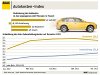 Im Jahr 2011 sind die Preise für die Anschaffung und den Unterhalt von Kraftfahrzeugen gegenüber dem Vorjahr um durchschnittlich 4,2 Prozent gestiegen. In dem Zeitraum stiegen die allgemeinen Lebenshaltungskosten um 2,3 Prozent. Die Hauptursache für die Verteuerung des Autofahrens liegt einmal mehr in den gestiegenen Kraftstoffpreisen. Sie haben sich im Jahresdurchschnitt um elf Prozent erhöht. Dies ist das Ergebnis des aktuellen Autokosten-Index, den das Statistische Bundesamt und der ADAC vierteljährlich veröffentlichen.