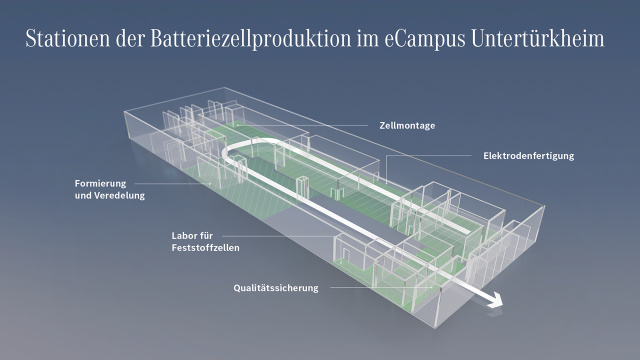 Der Prozess der Zellherstellung hat großen Einfluss auf die Qualität der Batterie. Daher hat Mercedes-Benz den Anspruch, nicht nur die chemische Zusammensetzung der Zellen zu beherrschen, sondern auch den industriellen Herstellungsprozess. Durch das neue „Industrial Cell Lab“ gewinnt das Unternehmen die Kompetenz für einen wirtschaftlichen Fertigungsprozess von Zellen mit „Mercedes-Benz DNA“. Es ergänzt somit die beiden bereits bestehenden Zelllabore: Im „Chemistry Lab“ werden neuartige Zellchemien und fortschrittliche Zelldesigns entwickelt und evaluiert. Im „Flexible Cell Lab“ werden die Neuentwicklungen im automobilen Pouchzellen-Format produziert und getestet.