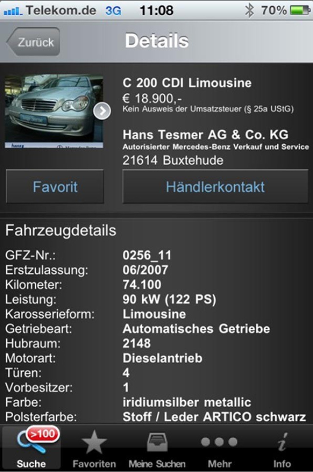 Die neue iPhone-App mit dem Namen Gebrauchtfahrzeuge von Mercedes-Benz" ist online. Sie bietet eine große Auswahl an Gebrauchtfahrzeugen, Vorführern und Jahreswagen der Mercedes-Benz Niederlassungen, Vertreter und Servicepartner. Insgesamt finden Interessenten in der App zurzeit circa 38.500 Fahrzeuge. Über verschiedene Suchkriterien wie das Modell, den Preis, die Erstzulassung bis hin zur Ausstattung und dem Standort können Interessenten den passenden Gebrauchten finden. Diese Kriterien können auch abgespeichert und zu einem späteren Zeitpunkt wieder verwendet werden.
