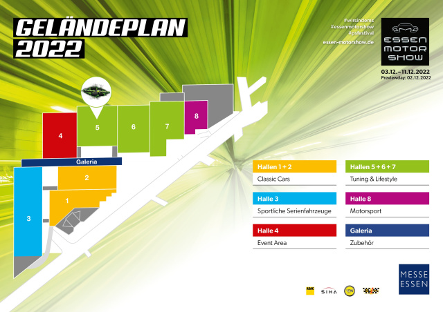 Die Essen Motor Show findet in diesem Jahr in neun Hallen statt und belegt damit nahezu das gesamte Gelände der Messe Essen. In den Hallen 1 und 2 erwartet die Besucher der Classic & Prestige Salon des Veranstalters S.I.H.A. mit klassischen Fahrzeugen. Die Hersteller und Zulieferer sportlicher Serienfahrzeuge präsentieren ihr Angebot in Halle 3. Die benachbarte Halle 4 wird zur großen Event Area, die Hallen 5 bis 7 sind für die Tuning- und Lifestyle-Branche reserviert. Die Aussteller aus dem Motorsport gehen in Halle 8 an den Start, und in der Galeria präsentieren zahlreiche Zubehör-Anbieter ihre Produkte auf einer Verkaufsmeile.