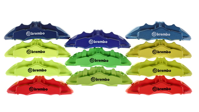 Zu Beginn der 1990er Jahre machte Brembo die Farbe zu einem der typischen Merkmale seiner Bremssättel. Seinerzeit führte der Bremsenspezialist die ersten rot lackierten Bremssättel ein und verwandelte auf diese Weise ein mechanisches Produkt in ein Kunstwerk. Seit der erstmaligen Verwendung vor 25 Jahren gilt Rot aus der Sicht des Unternehmens als Synonym für Höchstleistung. Die Farbe akzentuiert die außerordentliche Leistungsfähigkeit von Brembo Bremssätteln an solchen Fahrzeugen, die damit ausgestattet sind. Viele der diversen Farbabstufungen verweisen zudem auf charakteristische Leistungsprofile. Die Gold- und Gelb-Abstufungen sind oftmals Synonym für Anlagen mit CarbonKeramik Scheiben; die verschiedenen Blau-Nuancen stehen für Sportlichkeit und Eleganz. Nicht zu vergessen auch die vielfältigen Grautöne, die heute erhältlich sind. Der aktuelle Brembo Katalog weist ein Sortiment von über 100 Farbvarianten aus.