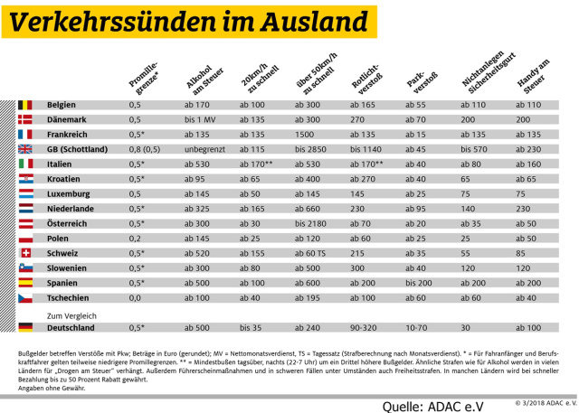 Die Osterferien stehen an. Da werden die Deutschen zum fahrenden Volk und machen sich mit Motorrad, Pkw und Reisemobile in alle Himmelsrichtungen auf. Doch Achtsamkeit ist geboten, sollte es Euch in ferne Länder ziehen, denn hier wird man kräftig zur Kasse gebeten, wenn man sich nicht an die Verkehrsregeln des jeweiligen Landes hältn. In einigen Fällen drohen sogar Haftstrafen. Besonders teuer wird es für denjenigen, der betrunken am Steuer sitzt, zu schnell fährt oder am Steuer telefoniert. Autoreisende sollten sich daher an die Verkehrsvorschriften halten. Der ADAC gibt einen Überblick über die wichtigsten Bußgelder in europäischen Reiseländern.