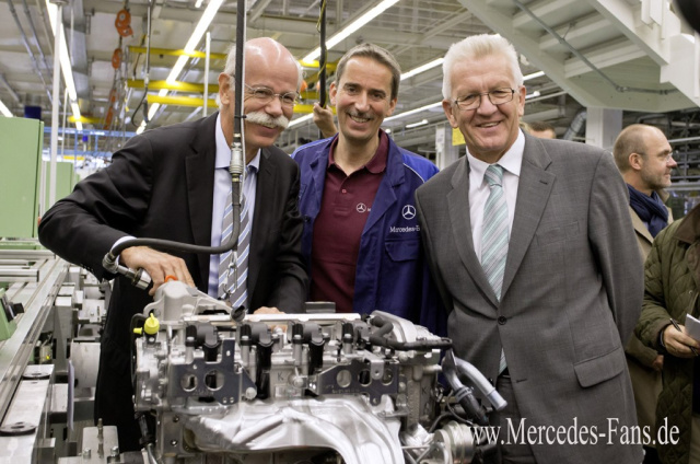 Im Mercedes-Benz Werk Untertürkheim begrüßte Dr. Dieter Zetsche, Vorsitzender des Vorstands der Daimler AG und Leiter Mercedes-Benz Cars, heute einen ganz besonderen Gast: Winfried Kretschmann, Ministerpräsident des Landes Baden-Württemberg, überzeugte sich im Rahmen eines Besuches im Stammwerk von den innovativen Produkten aus Untertürkheim. Dr. Dieter Zetsche und Peter Schabert, Leiter Produktion Powertrain und Leiter des Mercedes-Benz Werkes Untertürkheim, zeigten dem Ministerpräsidenten die Motorenmontage.