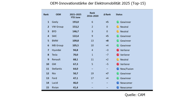 Aber auch die deutschen Automobilhersteller können die Innovationsstärke im Bereich Elektromobilität in den letzten Jahren deutlich steigern und etablieren sich zunehmend als zweitstärkste Kraft: Nach einer moderaten Position in den Jahren 2022–2024 nimmt der deutsche Innovationsanteil bis zum im ersten Halbjahr 2025 deutlich zu und erreicht rund ein Drittel der globalen Elektro- Innovationsstärke. Neben der VW Group, die weiterhin stabil auf Rang 2 rangiert, machen BMW und Mercedes im Periodenvergleich ein Sprung um 8 bzw. 4 Plätze nach vorn.