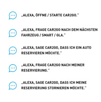 Deutschland, Österreich und den USA im Alexa Skill Store kostenlos aktivieren können. Eine Verknüpfung mit dem car2go Account des Kunden macht es möglich, dass damit wichtige Funktionen der car2go App in den eigenen vier Wänden auf Zuruf nutzbar sind – auch ganz komfortabel vom Sofa aus. Auf das Kommando „Alexa, frage car2go nach dem nächsten Auto“ sucht Alexa das nächste car2go Auto und berechnet dessen fußläufige Entfernung vom Zuhause des Kunden. Mit „Alexa, sage car2go, dass ich ein Auto reservieren möchte“ kann der Kunde ein Auto für 30 Minuten reservieren – wie über die car2go App auch. Außerdem kann er sich die verbleibende Reservierungszeit nennen oder die Reservierung stornieren lassen. Um das Fahrzeug mit dem Smartphone zu öffnen und die Miete zu starten, ist und bleibt ausschließlich die car2go App der Schlüssel.