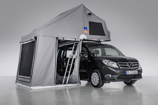 Auch das kleinste Mitglied der Mercedes-Benz Vans Familie lässt sich mit einfachen Mitteln zu einem Reisemobil für bis zu zwei Personen verwandeln. Das Dachzelt TopDog von Zeltspezialist 3DOG camping macht Kurzurlaube oder aktiven Freizeitsport mit Spontanübernachtung mit dem Mercedes-Benz Citan möglich. Das Klappdach-Zelt mit Cover inklusive Wohnzelt und integriertem Fußboden lässt sich in wenigen Minuten aufbauen. Zusammengeschnürt und auf dem Fahrzeugdach verstaut beträgt seine Höhe lediglich 25 bis 30 Zentimeter.
