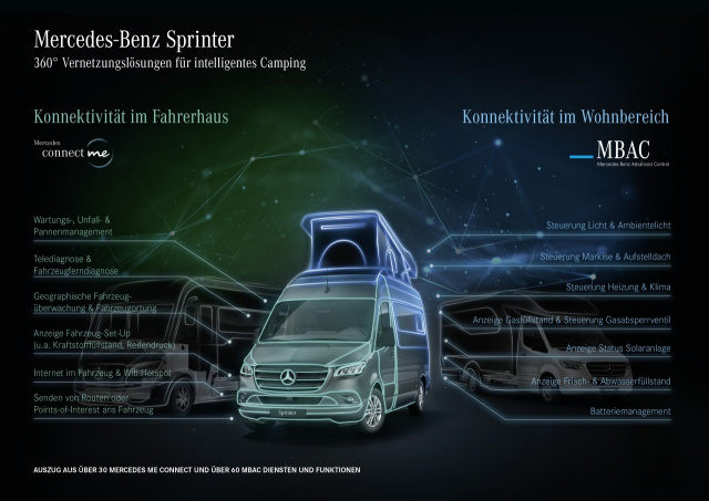Ab Ende des Jahres können Aufbauhersteller den Sprinter auf Wunsch mit Mercedes-Benz Advanced Control, kurz MBAC, bestellen. Die MBAC ist ein Schnittstellenmodul, welches ausgewählte Komponenten im Wohnbereich des Reisemobils vernetzt und deren Steuerung über einen zentralen Ort ermöglicht. Die zentralisierte Bedienung kann wahlweise über das MBUX-Touch-Display im Fahrzeug-Cockpit, ein separates Touch-Display im Wohnbereich, das von Aufbauherstellern frei positioniert werden kann, oder eine Smartphone-App erfolgen. Ebenso individuell kann der Aufbauhersteller bestimmen, welche Komponenten im Wohnbereich eingebunden werden, darunter: