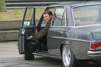 Einer der glorreichen Fünf, die Wind und Wetter trotzen, ist Timo Neuber. Der 32jährige Vollblut-Mercedes-Mechaniker kaufte seinen grünen 68er W108 als umgebauten US-Import. Jenseits des grossen Teichs wurde der Mercedes, welcher mal ein 280 SE mit Lenkradautomatik war, auf einen 200er Diesel mit manueller Schaltung umgebaut. Schuld war die Ölkrise am Anfang der 70er Jahre. Ein am Fraunhofer Institut beschäftigter Professor kümmerte sich um die Überführung. Zum Jahrtausendwechsel bekam die Limousine eine aufwändige Restaurierung. Bilstein Federn und neue Stoßdämpfer sorgen für eine satte Strassenlage. Die 16 Zoll Dunlop Bereifung kommt stilecht mit Weisswandringen daher.