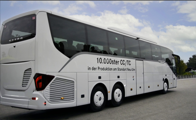 Mit einem Setra S 516 HD übernahm das Busunternehmen „Unser Roter Bus GmbH“ aus Mecklenburg-Vorpommern einen ganz besonderen Setra. Es ist der 10.000ste Reisebus der ComfortClass/TopClass der Modellreihe 500, der im Werk Neu-Ulm produziert wurde. Der mit 48 Sitzen ausgestattete 13,1 m lange Dreiachser der modellgepflegten Baureihe hat alle aktuellen Fahrer- und Sicherheitsassistenzsysteme an Bord, die Daimler Buses derzeit anbietet. Der neue Besitzer René Riechert ist beeindruckt. „Durch scheinbar kleine Detailanpassungen ist es den Entwicklern gelungen, den Reisebussen der ComfortClass ein vollkommen neues Familiengesicht zu geben“, so der Unternehmer, der neben dem Jubiläumsbus einen weiteren S 516 HD und einen S 511 HD in Betrieb genommen hat.