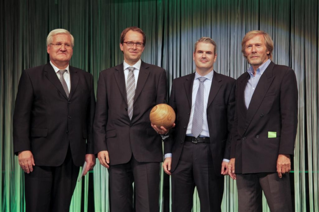 Die Laudatoren für die Kategorie "Mobilität", Dieter Freitag (links), Direktor Michelin Deutschland, Österreich und Schweiz sowie Horst Janson (rechts), Schauspieler, überreichen den Clean Tech Media Award an Andreas Leo (2. von links), Pressesprecher car2go und Christian Geiss (2. von rechts), Leiter Marketing & Sales car2go