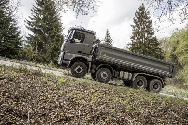 Im Mittelpunkt der Lkw für die Bauwirtschaft steht die A-Mannschaft von Mercedes-Benz. Ihr Zentrum bildet der Arocs, die spezialisierte Lkw-Baureihe für den Bauverkehr und damit ein echter Vollprofi. Der Arocs feierte seine Weltpremiere auf der Bauma 2013, jetzt ist er mit seinem vollen Programm lieferbar. Dazu gehört zum Beispiel der Arocs HAD mit dem zuschaltbarem Allradantrieb Hydraulic Auxiliary Drive. Er sorgt zurzeit in der Baubranche für Furore. Zur Bauma 2016 erweitert Mercedes-Benz das Spektrum des Arocs um ein neues Hypoidachs-Tandem in zwei verschiedenen Ausführungen (2x10t und 2x13t) für noch höhere Effizienz, um Fahrerhausvarianten mit niedrigem Einstieg und um zusätzliche Aus-stattungsvarianten wie ein Cockpit mit hellem Interieur und optionaler Ausstattung mit Home-Line oder Style-Line. Mit sechs Fahrzeugen demonstriert der Arocs auf der Bauma sein Können.