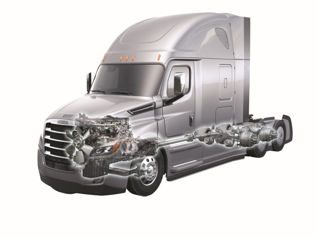 Ein wesentlicher Schwerpunkt bei der Entwicklung des neuen Cascadia lag auf einer weiteren deutlichen Verbrauchsreduktion. Die frische aerodynamische Form und die hochentwickelten Antriebskomponenten tragen maßgeblich dazu bei, dass der Verbrauch gegenüber einem Cascadia Evolution aus dem Jahr 2016 um acht Prozent sinkt. Einer der größten Vorzüge des neuen Cascadia ist sein integrierter Antriebsstrang. Im Gegensatz zu Europa ist es auf dem nordamerikanischen Nutzfahrzeugmarkt nach wie vor üblich, dass der Kunde Aggregate von Drittherstellern in seinen Lkw hat. Daimler Trucks dagegen bietet seinen amerikanischen Kunden ein perfekt aufeinander abgestimmtes Antriebssystem, bestehend aus eigenen Motoren, Getrieben und Achsen. Der Erfolg des integrierten Detroit Powertrain für Schwerlastfahrzeuge in den USA ist enorm. Nahezu 95 Prozent der Cascadia Kunden entscheiden sich inzwischen für die Detroit Schwerlastmotoren von Daimler Trucks, 65 Prozent für das Automatikgetriebe Detroit DT12.