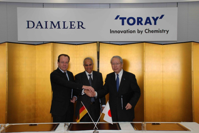 Toray Industries, Inc. und der deutsche Premiumautomobilhersteller Daimler AG bei der Unterzeichnung eines gemeinsamen Joint Ventures für die Herstellung und Vermarktung von Automobilteilen aus carbonfaserverstärkten Kunststoffen (CFK).