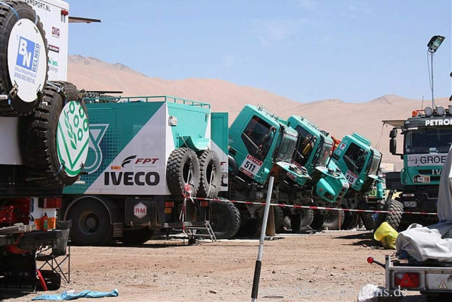 Klassischerweise am Restday erhalten alle Fahrzeuge den `grossen Service`. Im Endeffekt wird alles komplett zerlegt und je nach Laufzeiten alles für die zweite Hälfte der Rallye erneuert. Einige Fahrer trudeln am nachmittag im Bivak ein, falls sie denn im Hotel übernachtet haben, einige recken sich ebenfalls in den späteren Stunden des Tages, wenn die Sonne das Zelt quälend aufgeheizt hat, aus der Schlafstatt. Wir nutzen die Zeit für Interviews und erfahren, dass die Dakar gestern wieder einmal für einige typische Geschichten gut war. So kommt Thomas Wallenwein, mein Kollege bei der German Offroad Masters, erst in den späten Morgenstunden mit einem deutlich demolierten Truck ins Ziel. Eine Rolle in den Dünen und das spätere Aufrichten des LKW übers Dach, haben den Renntruck nachhaltig aber nicht schwer beschädigt. Seine Crew ist eine von vielen, die heute in den Dünen übernachtet haben (zumindest zwei Stunden lang).