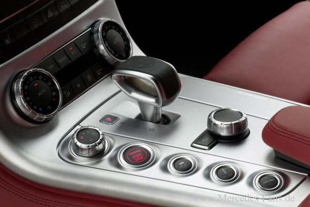 Ein Blick auf die Mittelkonsole des SLS AMG zeigt nicht nur den reizvoll gestalteten, neuen E-SELECT-Wählhebel mit geprägtem AMG Wappen, sondern auch ein neues Stoßdämpfersymbol in der AMG DRIVE UNIT. Der Taster weist auf das neue AMG RIDE CONTROL-Sportfahrwerk mit variabler, elektronisch geregelter Dämpfung hin. Je nach Fahrsituation, Fahrgeschwindigkeit und Fahrbahnzustand variiert das auf Wunsch erhältliche System blitzschnell die Dämpferkennung und reduziert automatisch die Wankwinkel der Karosserie. Für den Fahrer bedeutet dies ein blitzschnelles und stufenloses Anpassen zwischen größtmöglicher Agilität und optimalem Fahrkomfort je nach Fahrstil und Streckenführung.