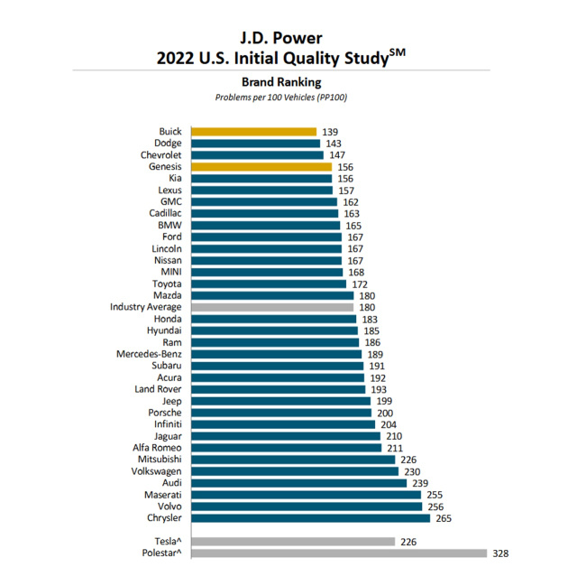 Interessant zu sehen ist, dass bei Volumenmarken weniger Probleme auftreten als bei Premiumfahrzeugen: Volumenhersteller haben im Durchschnitt 175 Probleme auf 100 Fahrzeuge. Das sind 21 Probleme auf 100 Fahrzeuge weniger als bei Premiummarken (im Durchschnitt: 196 Probleme auf 100 Fahrzeuge). J.D. Power erklärt sich das Phänomen so: Käufer von Premiummarken kaufen in der Regel mehr Technik für ihre Fahrzeuge. Die Komplexität dieser Technik erhöht offenbar die Wahrscheinlichkeit von Problemen. Einerseits. Andererseits: Andere Premium-Marken wie Genesis und Lexus haben diese Probleme nicht und können ein eine deutlich geringere Problemquote als Mercedes-Benz aufweisen.
