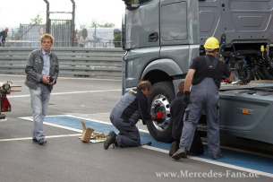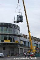 Hoch hinaus sollte der Actros bei seiner Publikumspremiere in der Eifel beim truck Grand Prix. Und zwar am besten auf das Dach der Mercedes Lounge am Ende der Start und Zielgeraden, direkt vis-a-vis der Mercedes-Tribüne. Um dies zu bewerkstelligen hat ein Spezialistenteam am Vorabend den neuen Actros in schwindelige Höhe gehieft. Und das, was so ausschaut wie eine waghalsige Action, ist in Wirklichkeit der professionelle Job ausgewiesener Experten. Die Bilder schauen aber schon recht spektakulär aus, oder?