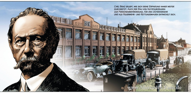Carl Benz Ein Leben für das Automobil heißt der erste Comic von Mercedes-Benz, der die Erfindung des Automobils und die faszinierende Lebensgeschichte seines Schöpfers, Carl Benz, in bunten Bildern erzählt. Der Comic illustriert auf 52 Seiten die wichtigsten Meilensteine aus dem Leben von Carl Benz, beginnend mit seiner Geburt am 25. November 1844.