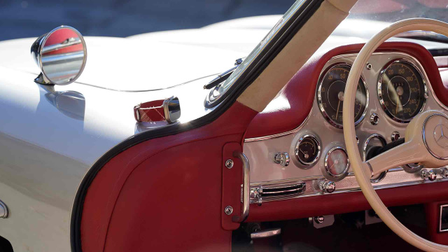 Bei klassischen Luxusautomobilen denken viele instinktiv an schweres Leder. Doch der 300 SL war ein Kind des Rennsports, ein technischer Vorreiter der 1950er Jahre. Und zu dieser sportlichen DNA gehörte oft kein Leder, sondern ein hochwertiger, atmungsaktiver Karostoff auf den Sitzmittelbahnen. Er sorgte für besseren Halt in Kurven und angenehme Temperaturen im heißen Cockpit.