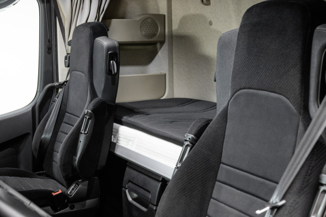 Das Arbeitsumfeld des Fahrer ist erheblich verbessert worden. In den Ausführungen StreamSpace, BigSpace und GigaSpace verfügt die Fahrerkabine über eine Breite von 2,50 Metern. Da ein Motortunnel fehlt, gibt es im Fahrerhaus einen ebenen Boden - das sorgt für eine wohnlichere Atmosphäre. Darüber hinaus hält die optimierte Schalldämmung der Kabine Störgeräusche klein, was in den Ruhezeiten der Entspannung des Fahrers zugutekommt. Apropos Entspannung: Eine um 40 Millimeter niedrigere Sitzposition trägt zum entspannteren Fahren bei und ermöglicht zugleich eine komfortable Sicht auf die Straße. Positiv auf den Fahrerkomfort wirken sich auch die höherwertigen Materialien der Innenraumausstattung aus.