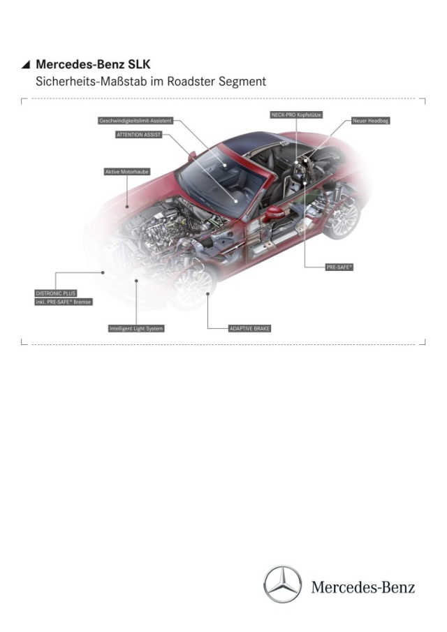 Im Januar 2011 stellt Mercedes-Benz den neuen SLK vor. Der agile Sportwagen wird ein neues, aufregendes Design, für einen Roadster ungewöhnlich hohen Komfort sowie jede Menge Open-Air-Fahrspaß bieten. Zugleich wird er in puncto Sicherheit neue Maßstäbe für offene Sportwagen setzen. Die dritte Generation des Trendsetters wird eine Vielzahl moderner Assistenzsysteme zur Unterstützung des Fahrers nutzen. Darunter serienmäßig die von Mercedes-Benz entwickelte Müdigkeitserkennung ATTENTION ASSIST und auf Wunsch das weltweit einzigartige vorausschauende Insassenschutzsystem PRE-SAFE® sowie die PRE-SAFE® Bremse, die bei einem drohenden Auffahrunfall autonom bremsen kann. Damit geht Mercedes-Benz auch mit dem SLK 2011 konsequent weit über die Vorgaben der Sicherheitsnormen hinaus.