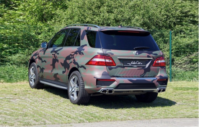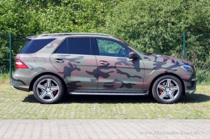 Das macht auch nicht jeder mit 'nem ML 63 AMG, oder? Ein neuer Mercedes-Benz SUV wurde folioCar, eine Marke der INTAX GmbH, komplett in eine Folie mit Camouflage-Design eingehüllt. Eigens für diesen Geländewagen wurde dazu eine Folie mit einem hochauflösenden Druck versehen.