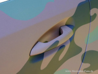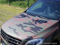 Bis auf wenige Elemente wie Spiegeldreiecke, Dachreling, Felgen oder Lüftungsgitter und Leuchten natürlich bekam die Karosserie des ML 63 AMG die Flecktarn-Folie verpasst.