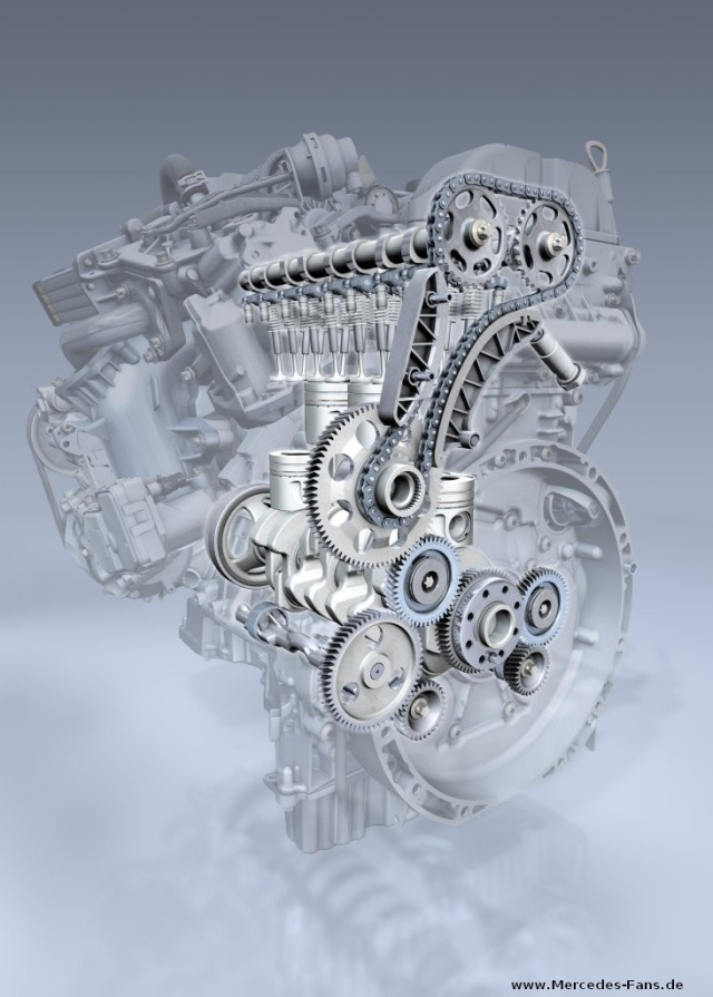 Der V6 OM 642 mit drei Liter Hubraum der einzige Sechszylinder in einem Transporter in Europa gehört mit seiner brillanten Technik zu den Glanzstücken des Motorenbaus von Mercedes-Benz. Der langhubige Motor (Bohrung x Hub 83 x 92 mm) basiert auf einem Kurbelgehäuse aus Aluminium mit einem V-Winkel von 72 Grad.
