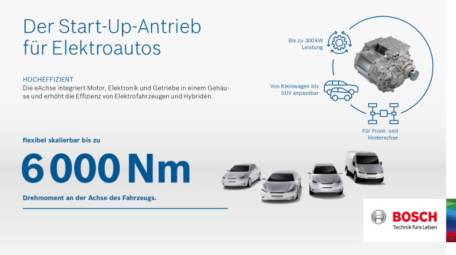Die Leistung des Antriebs kann sich zwischen 50 Kilowatt und 300 Kilowatt bewegen und ist somit auch geeignet, um große Fahrzeuge wie SUV rein elektrisch anzutreiben. Das Drehmoment an der Achse des Fahrzeugs kann zwischen 1 000 und 6 000 Newtonmetern liegen. Der Antrieb kann sowohl an Vorder- als auch an Hinterachsen von Hybriden und Elektroautos verbaut werden. Eine elektrische Achse mit einer Leistung von 150 Kilowatt wiegt etwa 90 Kilogramm und damit wesentlich weniger als bisherige Einzelkomponenten zusammen. Im Vergleich zu Wettbewerber-Produkten zeichnet sich die elektrische Achse von Bosch durch eine besonders hohe Leistungsspitze, kombiniert mit hoher Dauerleistung aus – der E-Antrieb kann also besser beschleunigen und gleichzeitig länger hohe Geschwindigkeiten halten. Dafür hat Bosch nicht nur das Gesamtsystem neu gestaltet, sondern auch den enthaltenen Motor und die Leistungselektronik nochmals einzeln optimiert.