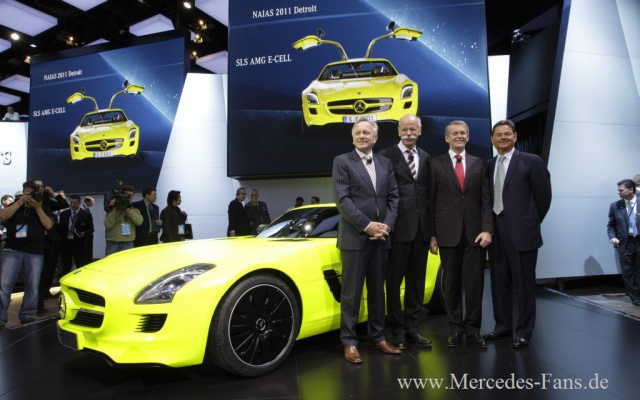 Der Mercedes-Benz SLS AMG E-CELL ist der technisch fortschrittlichste Supersportwagen in der 125-jährigen Geschichte des Automobils und zeigt, wie faszinierend Elektromobilität sein kann. Unsere Kunden können ihn ab 2013 bei unseren Händlern bestellen, so Dr. Dieter Zetsche, Vorstandsvorsitzender der Daimler AG und Leiter Mercedes-Benz Cars, im Rahmen der Mercedes-Pressekonferenz auf dem neu gestalteten Mercedes-Messestand, der die vielfältige Antriebsstrategie des Stuttgarter Automobilherstellers auf knapp 1.800 Quadratmetern Fläche dreidimensional erlebbar macht.