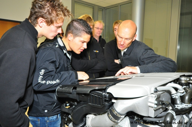 Der SLS vereint für mich zwei Ziele: Sportlichkeit und Eleganz, genau das macht für mich den Reiz von AMG aus, schwärmte Christopher Mies. Bei der anschließenden Werksführung konnten die Nachwuchstalente den Technikern von AMG über die Schulter schauen. Sie wurden Zeuge, wie zum Beispiel ein V8 Saugmotor von einem Mechaniker in drei Stunden zusammengebaut wurde.