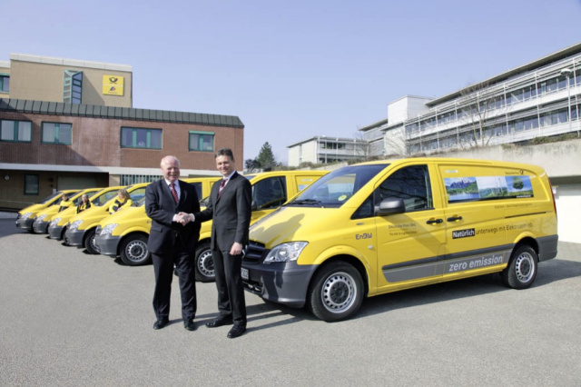 Im Waiblinger Zustelldepot der Deutschen Post übergab Andreas Burkhart, Leiter Vertrieb & Marketing Mercedes-Benz Vans die Schlüssel von sieben Mercedes-Benz Vito E-CELL an Uwe Brinks, Bereichsvorstand der Deutschen Post DHL. Zusammen mit fünf Fahrzeugen, die bereits in Berlin im Einsatz sind und weiteren drei Vito E-CELL, die in den nächsten Tagen übergeben werden, besitzt die Deutsche Post somit eine Flotte von fünfzehn umweltfreundlichen Vito E-CELL. Dies ist die größte Anzahl von rein elektromotorisch angetriebenen Vito, die derzeit bei einem Kunden im regulären Dauereinsatz integriert sind. Neben geringen Geräuschen zeichnet sich der Mercedes-Benz Vito durch eine absolute Emissionsfreiheit vor Ort aus.