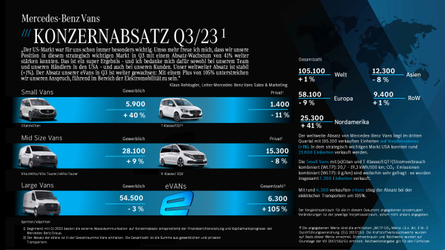 Mercedes-Benz Vans erzielte seit Jahresbeginn ein weltweites Absatzplus von 11% mit 323.500 verkauften Einheiten mit stabiler Absatzentwicklung in den Kernmärkten Europa (+12%) und USA (+13%). Der weltweite Absatz liegt im dritten Quartal 2023 auf Vorjahresniveau (+1%). In Summe hat die Van-Sparte in Q3 105.100 Transporter mit Stern verkauft.