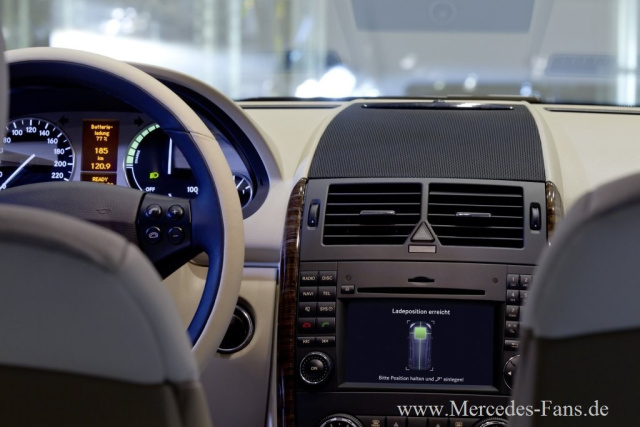 Statt eines Kabelkontakts wird beim induktiven Laden das Auto einfach über einer im Boden installierten Ladespule positioniert. Die Elektronik erkennt die Ladespule und startet den Ladevorgang dann vollautomatisch. Daimler und Conductix-Wampfler haben diese Technik in einem Förderprojekt des Bundesumweltministeriums erstmals erprobt. Die modifizierte A-Klasse E-CELL, die im Effizienzhaus-Plus zum Einsatz kommt, kann entweder mit Stecker oder induktiv über eine Magnetspule im Boden aufgeladen werden. Die automatische Aktivierung des Ladevorgangs und ein Assisstenzsystem, das beim genauen Parken über der Ladespule hilft, garantieren den typischen Mercedes-Benz Bedienkomfort.
