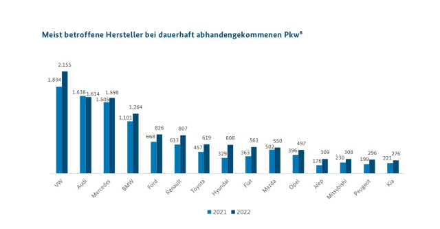 Die Zahl der Autodiebstähle in Deutschland steigt wieder an. Das geht aus dem im Juli veröffentlichten „Bundeslagebild Kfz-Kriminalität 2022“ des Bundeskriminalamtes (BKA) hervor. Demnach wurden im vergangenen Jahr 14.611 Pkw dauerhaft entwendet. Das sind 19,6 Prozent mehr als im Jahr 2021. Die Autoklauer hatten es besonders auf deutsche Marken abgesehen. Mercedes-Benz gehört zu den Favoriten der Fahrzeugdiebe. VW (2.155 dauerhaft abhanden gekommene Pkw) und Audi (1.614) stehen im Rankingauf Platz 1 und 2. Mit 1.598 sauerhaft abhanden gekommenen Autos rangiert der Stern auf der Beliebtheitsskala der Autoklauer auf Rang 3 vor BMW (1.264).