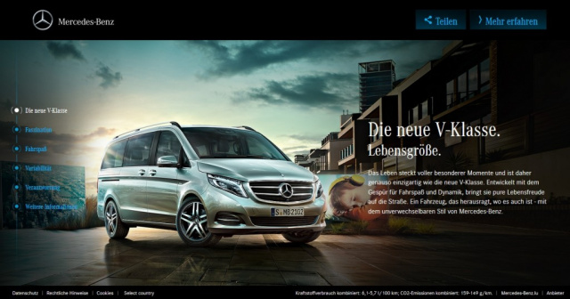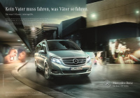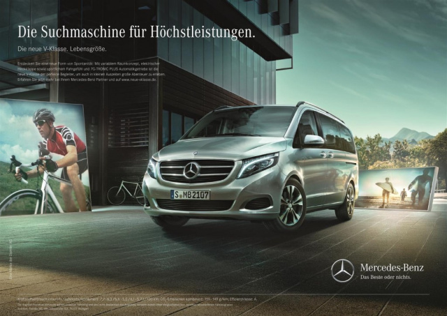 Unter dem Claim Die neue V-Klasse. Lebensgröße. startet Mercedes-Benz die Markteinführungskampagne für seine neu entwickelte Großraumlimousine. Auf humorvolle Weise spielt die integrierte Kampagne mit dem weit verbreiteten Klischee des funktional langweiligen Familienfahrzeugs und inszeniert die neue V-Klasse als Trendsetter für eine neue Erlebniswelt von automobiler Größe. Im Zentrum stehen Printanzeigen, ein TV-Spot, ein Online-Videoclip und ein interaktives Webspecial. Sie setzen die Kernbotschaft perfekt in Szene: Die V-Klasse ist ein echter Mercedes-Benz Premium-Pkw.