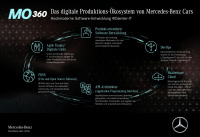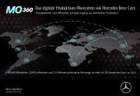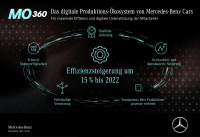 Die Digitalisierung der eigenen Produktion ist für Mercedes-Benz seit 30 Jahren ein wichtiger Erfolgsfaktor. Das neue digitale Ökosystem MO360 ist darin ein Meilenstein. In enger Kooperation entwickelt haben es die Produktionsspezialisten von Mercedes-Benz Cars Operations mit den IT-Experten von Daimler. Weite Teile des modular aufgebauten und erweiterbaren Ökosystems sind in den mehr als 30 Werken auf der ganzen Welt bereits im Einsatz. In der neuen Factory 56 in Sindelfingen, die im September 2020 eröffnet wird, kommt MO360 erstmals vollständig zur Anwendung. MO360 integriert Informationen aus den wichtigsten Produktionsprozessen und IT-Systemen der Werke und vereint wichtige Softwareapplikationen. Dazu gehören etwa das Qualitätsmanagementsystem QUALITY LIVE und das Shopfloormanagement SFMdigital. MO360 optimiert beispielsweise erheblich die auf Kennzahlen basierende Produktionssteuerung. Zum anderen stellt es in Echtzeit jedem Mitarbeiter individuelle und bedarfsgerechte Informationen und Arbeitsanweisungen bereit. Modernste Cloud-Lösungen bringen Skalierbarkeit und ermöglichen eine weitreichende Big-Data-Verarbeitung. Das alles macht MO360 zum zentralen Ökosystem von Mercedes-Benz Cars Operations. Damit ist es zugleich der neue Maßstab für die hochdigitalisierte Automobilproduktion. Sukzessive werden in MO360 weitere Anwendungen integriert, etwa für die vorausschauende Instandhaltung aller Mercedes-Benz Werke weltweit.
