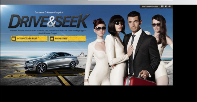Das neue Mercedes C-Klasse Coupé wird zum Filmstar. Und Sie auch. Der interaktive Kurzfilm "Drive & Seek" ist online. In dem Action geladenen Film ist man als Zuschauer mittendrin statt nur dabei. Man kann direkt ins Geschehen per Mausclick eingreifen. Aber, Obacht: In dem Film geht es hoch her. Der Trailer gibt einen Vorgeschmack auf das, was Sie erwartet. Direkt zum interaktiven Film: "Drive & Seek" kommen Sie hier mit einem Klick.
