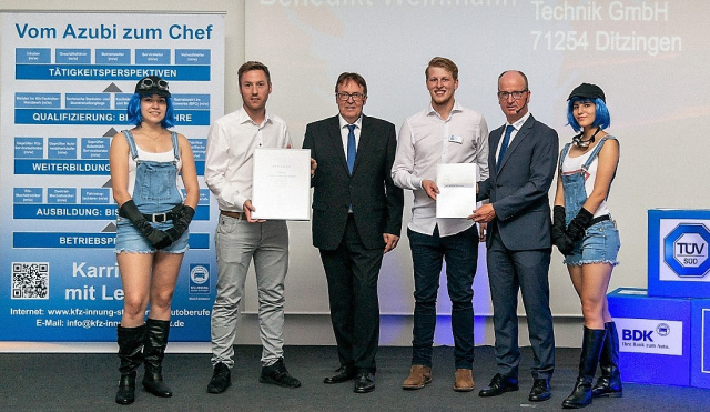 Der auf die Restaurierung von hochwertigen Mercedes-Benz Klassikern spezialisierte Familienbetrieb Kienle Automobiltechnik in Heimerdingen bei Stuttgart hat zum zweiten Mal in Folge den jahrgangsbesten Kfz-Mechatroniker des Landkreises Ludwigsburg ausgebildet. Nach der letztjährigen Preisträgerin Rebecca Rietl als beste Kfz-Mechatronikerin hat jetzt Benedikt Weinmann bei der Lossprechung einen Preis als bester Kfz-Mechatroniker erhalten.